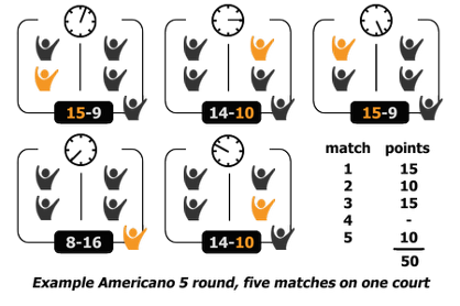 Het is een speelvorm waarbij je begint met vijf spelers op één baan (wordt gespeeld op 4 banen). Americano5 bestaat uit 2 rondes van 1 uur. Je speelt per ronde meerdere (gem. 4) korte wedstrijden van 12 minuten, waarin je tegen andere spelers speelt en één wedstrijd pauzeert.